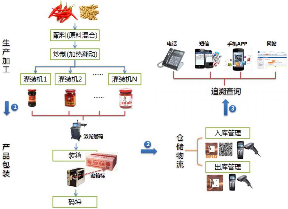 從原料、生產、包裝、倉儲、物流配送、經銷到消費者手中,實現調味品追溯過程中各環節系統之間的信息采集,增強信息的時效性,從而做到全程信息的全面化、一體化和可視化、實現原料、成品、供應商等基礎數據、庫存狀況、經營數據集成,實現信息共享和高效協同運作,達到對調味品的及時有效跟蹤與追溯。 |